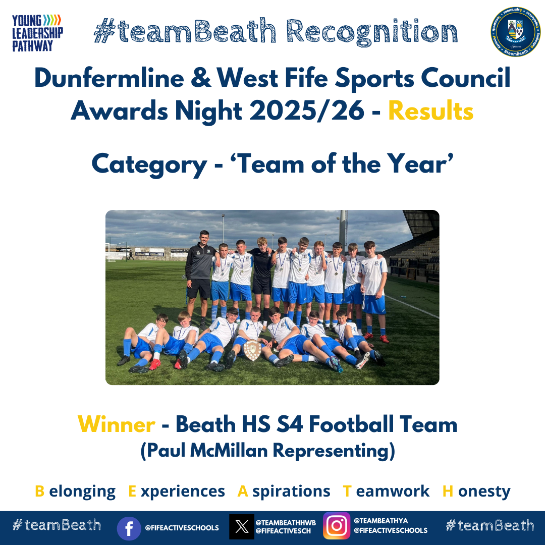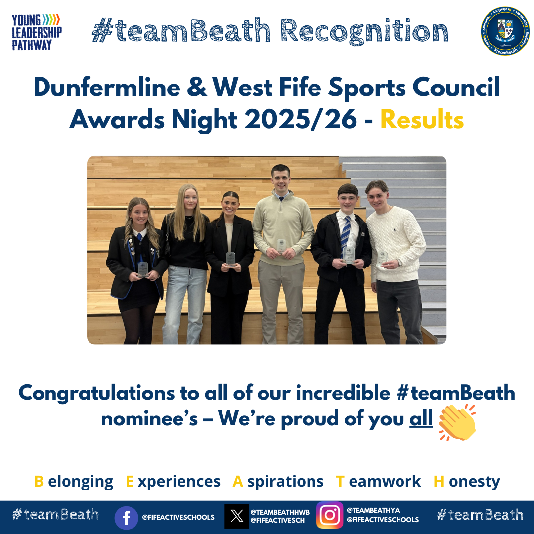 #teamBeath were represented once again at the annual Dunfermline and West Fife Sports Council Awards Evening, an event that shines a spotlight on the outstanding sporting talent, dedication, and leadership displayed across the school and in our local community. This year’s ceremony celebrated an array of remarkable achievements from Beath HS pupil and staff highlighting the strength and depth of school sport within our area.